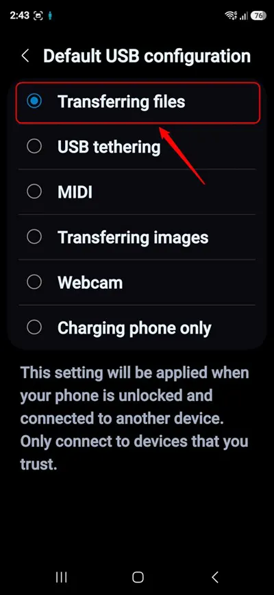 To improve security, Samsung now sets the default USB mode to Charging only. This means you must manually select File Transfer whenever you want to access your phone’s storage from a computer.